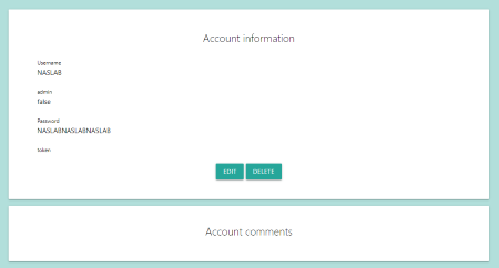 A user can view his profile through the /users/X route, where $X$ is user’s ID, assigned incrementally by the web application. A user can display his password and his token. (Figure 7)